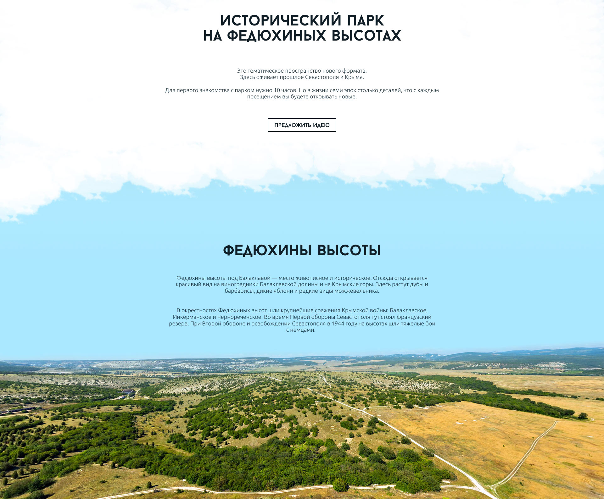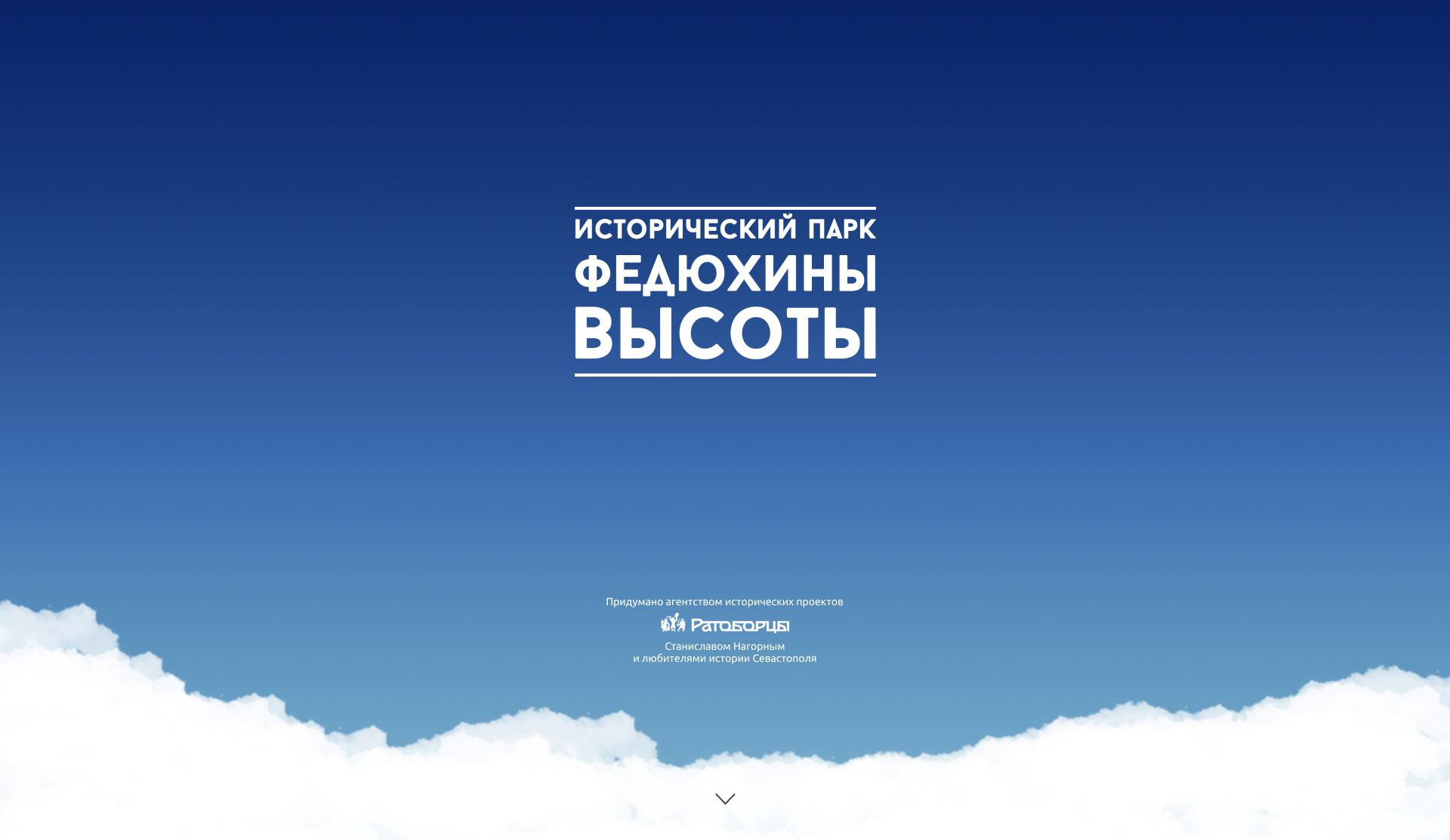 Шапка сайта выполнена в ультра-минимализме, акцентируя внимание посетителя лишь на логотипе парка и плашке его создателей. В нижней части экрана плывут анимированные облака, а на голубом небе периодически просматриваются звезды и даже планеты.
