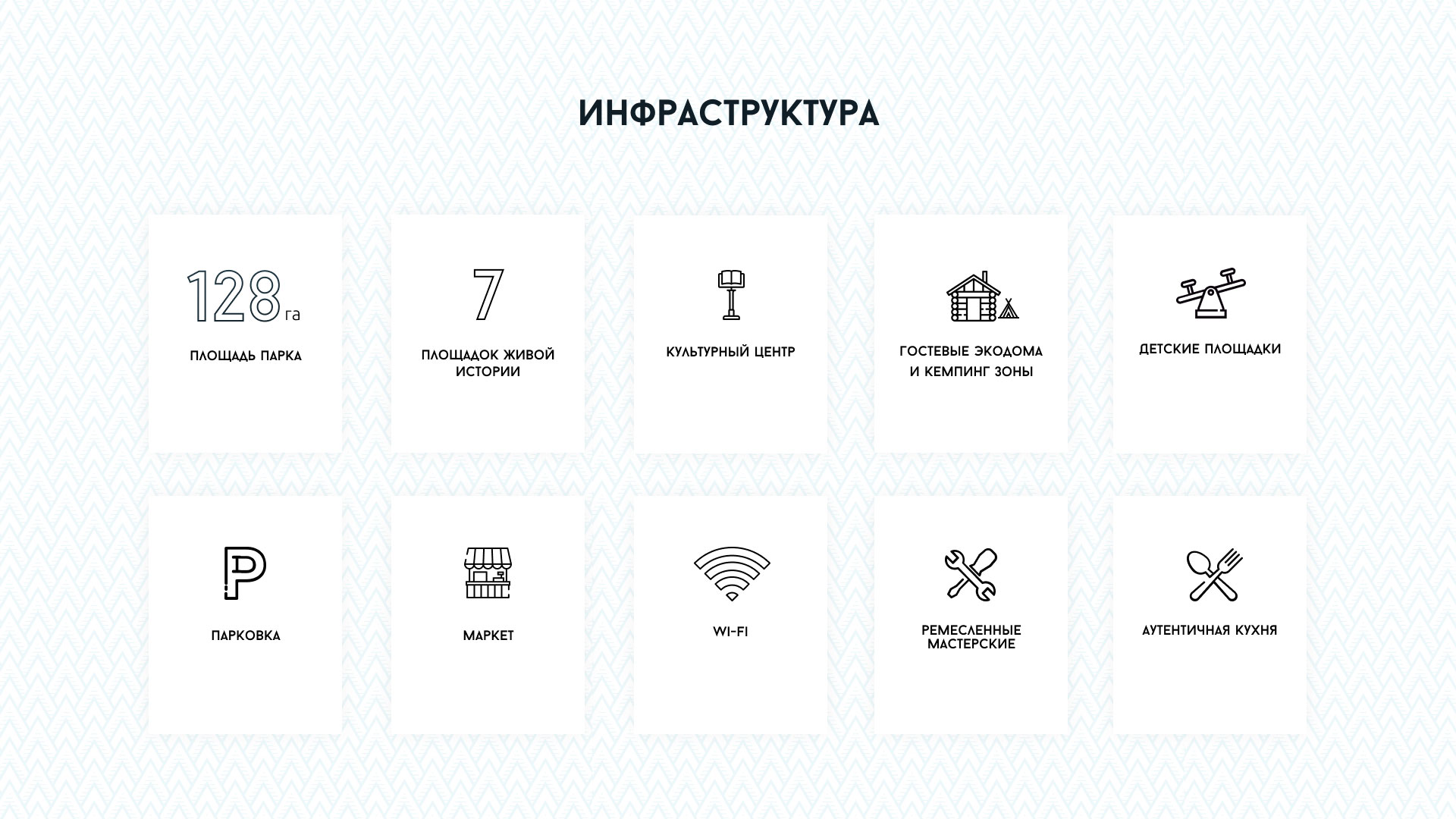 Основная информация об инфраструктуре парка подается в виде наглядных карточек. При клике на них, открывается всплывающее окно, где посетитель может более подробно ознакомиться со всей информацией, чтобы не перегружать главную страницу большим количеством текста и изображений.