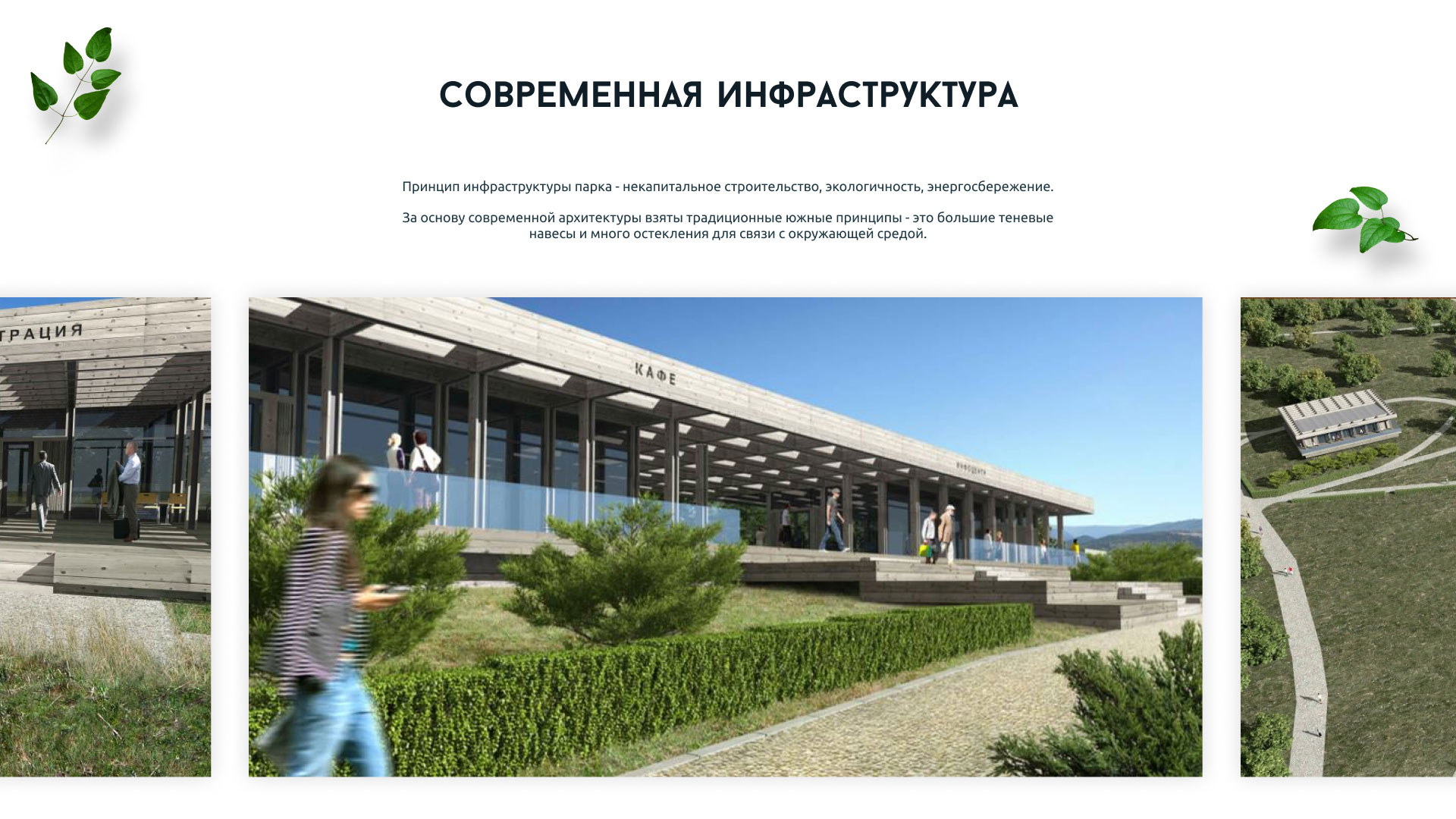 Ключевым элементам инфраструктуры посвящены отдельные кадры с описанием, листая которые посетитель сайта наглядно может ознакомиться с тем, что он увидит на месте.