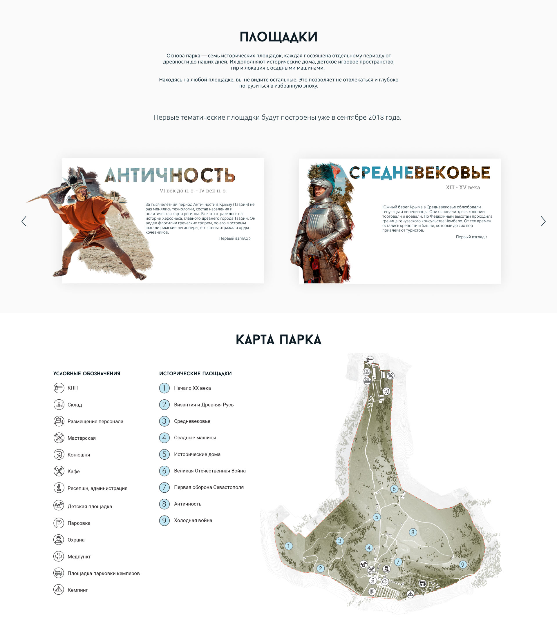 Парк довольно большой, и на его территории много площадок, посвященных разным эпохам. Агентство разработало для каждой из них отдельные информационные карточки и страницы, каждая из которых наглядно отражает антураж исторического периода.