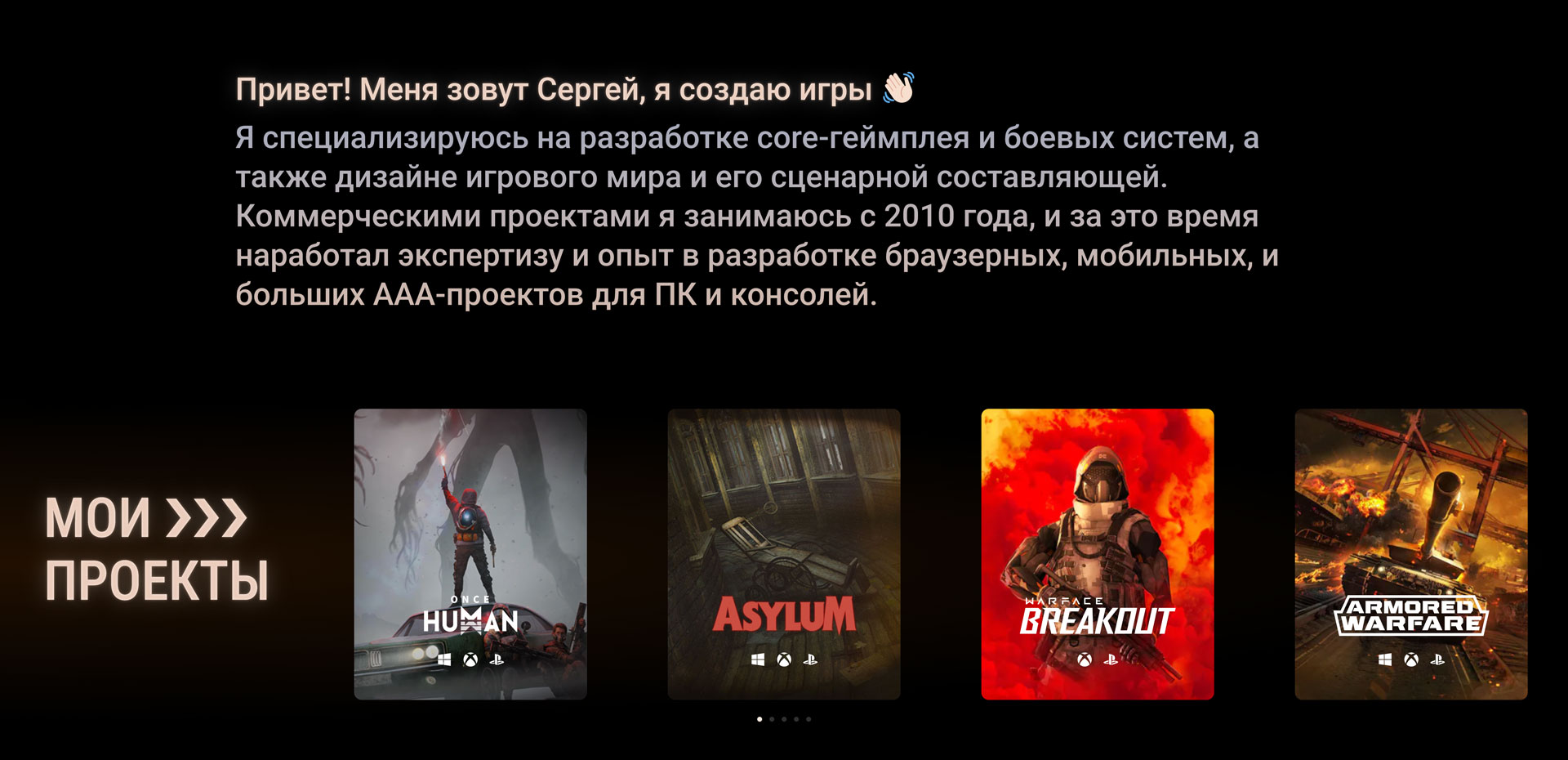 Ниже, на этом же экране, представлен слайдер с постерами проектов, над которыми работал Сергей. Каждый постер мы оформили с использованием главного изображения проекта, его логотипа, а также логотипов платформ, на которых выходила игра. Кроме того, у сайта есть редактор, который позволяет самостоятельно добавлять новые проекты и постеры проектов без необходимости каждый раз с нуля создавать их ручную. Простое заполнение формы, и сайт сам сформирует постер в едином стиле с остальными.