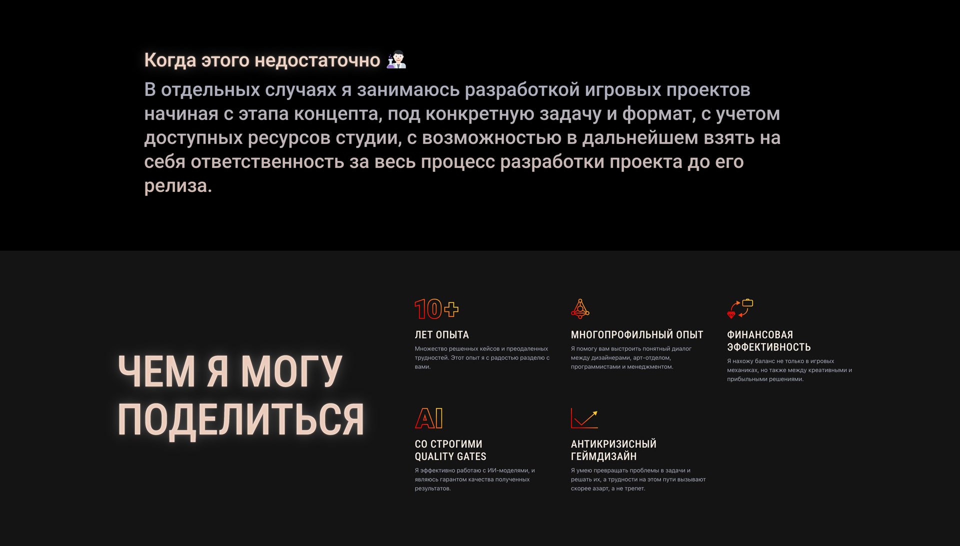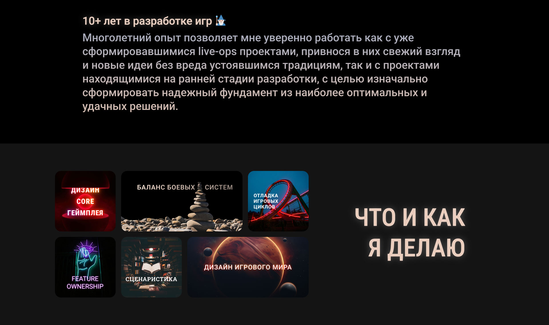 Сергей занимается дизайном компьютерных игр, и для презентации своих услуг заказчикам, а также как часть развития личного бренда обратился к нам для создания сайта, который мог бы презентовать его как специалиста.