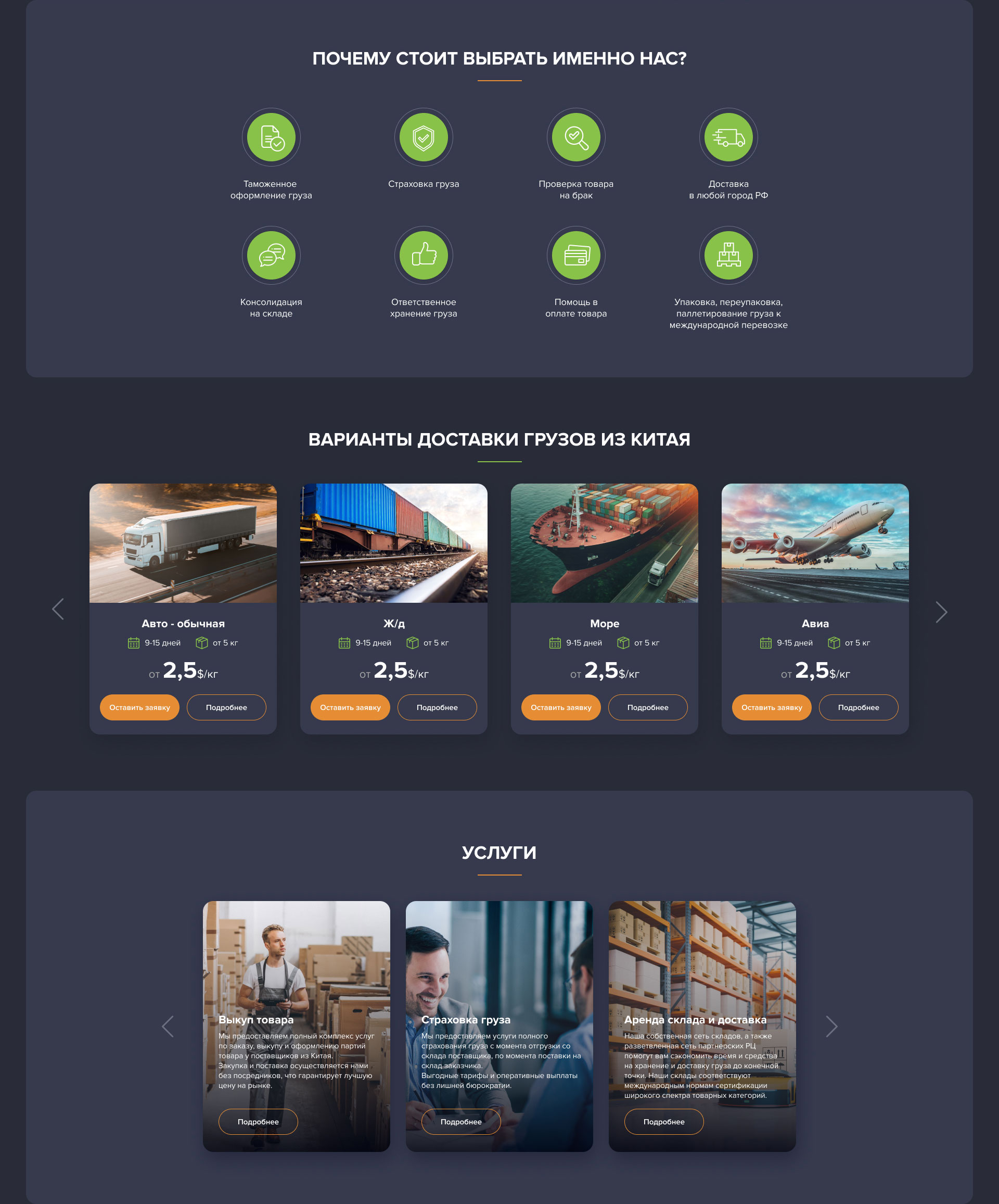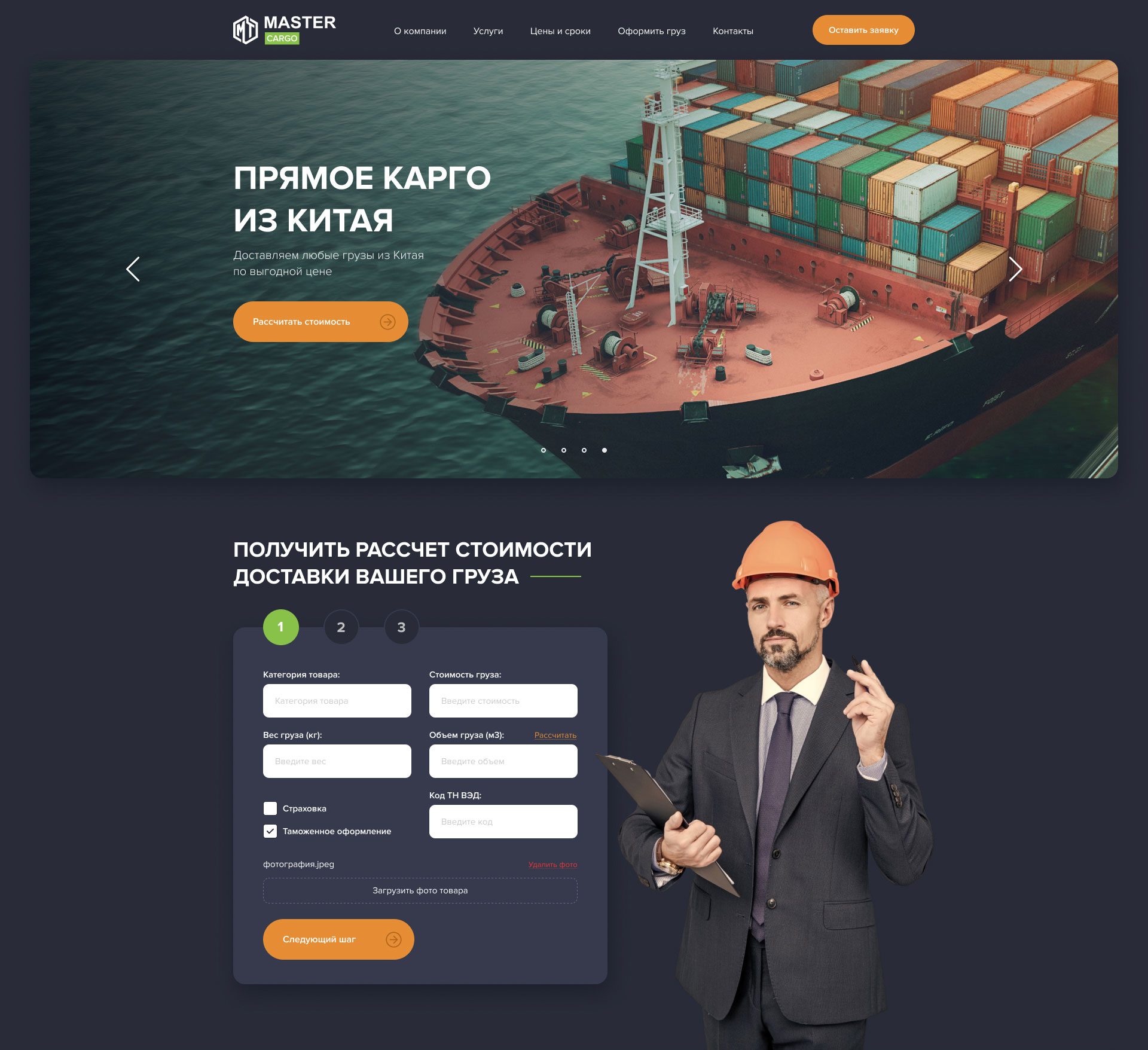 Сайт выдержан в строгом стиле, но первый же экран встречет посетителя насыщенной графикой, которая сразу же эллюстрирует сферу деятельности компании. Без лишних слов и заезженых продающи тектов, сайт презентует главную услугу компании, и сразу предлагает заполнить простую форму дляначала сотрудничества. Постоянным клиентам не нужно даже прокручивать страницу чтобы составить заявку на доставку груза.